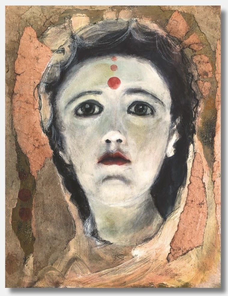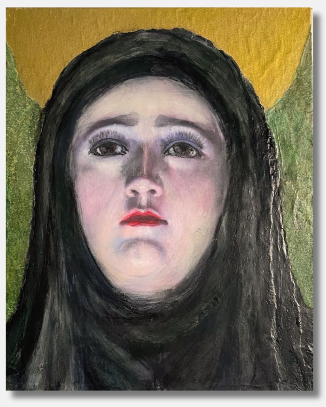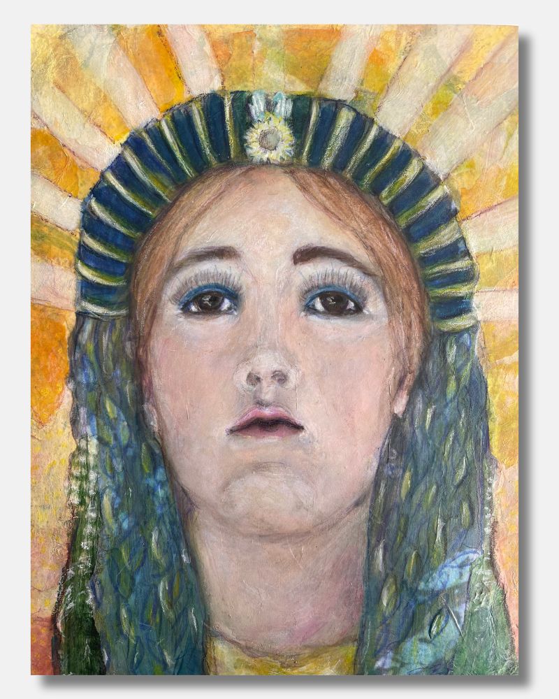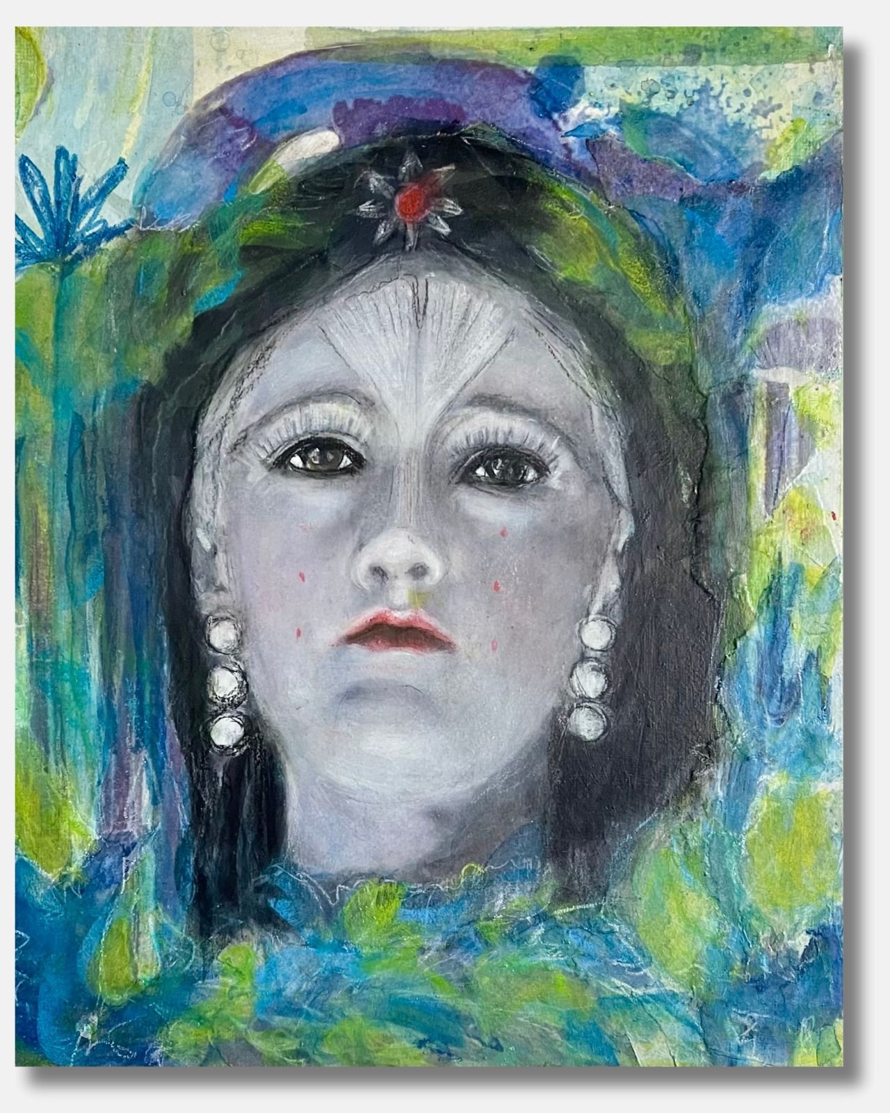 Das Bild „Merlin“ beschäftigt sich tatsächlich mit der Sagengestalt dieses Zauberers. In anderen Gemälden werden weitere Sagen wie die um Artus oder Mythologien ebenso wie religiöse Geschichten und Figuren aufgegriffen – doch nie handelt es sich um eine Illustration der Malerin, vielmehr ist das, was auf der Leinwand entsteht, eine angedeutete Interpretation, die genügend Freiraum für die Kreativität des Betrachters lässt.“